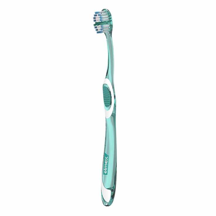 Die elmex SENSITIVE WEICH Zahnbürste mit ihren optimal endabgerundeten schräg gestellten grünen Borsten reinigt die kariesgefährdeten Zahnzwischenräume gründlich.