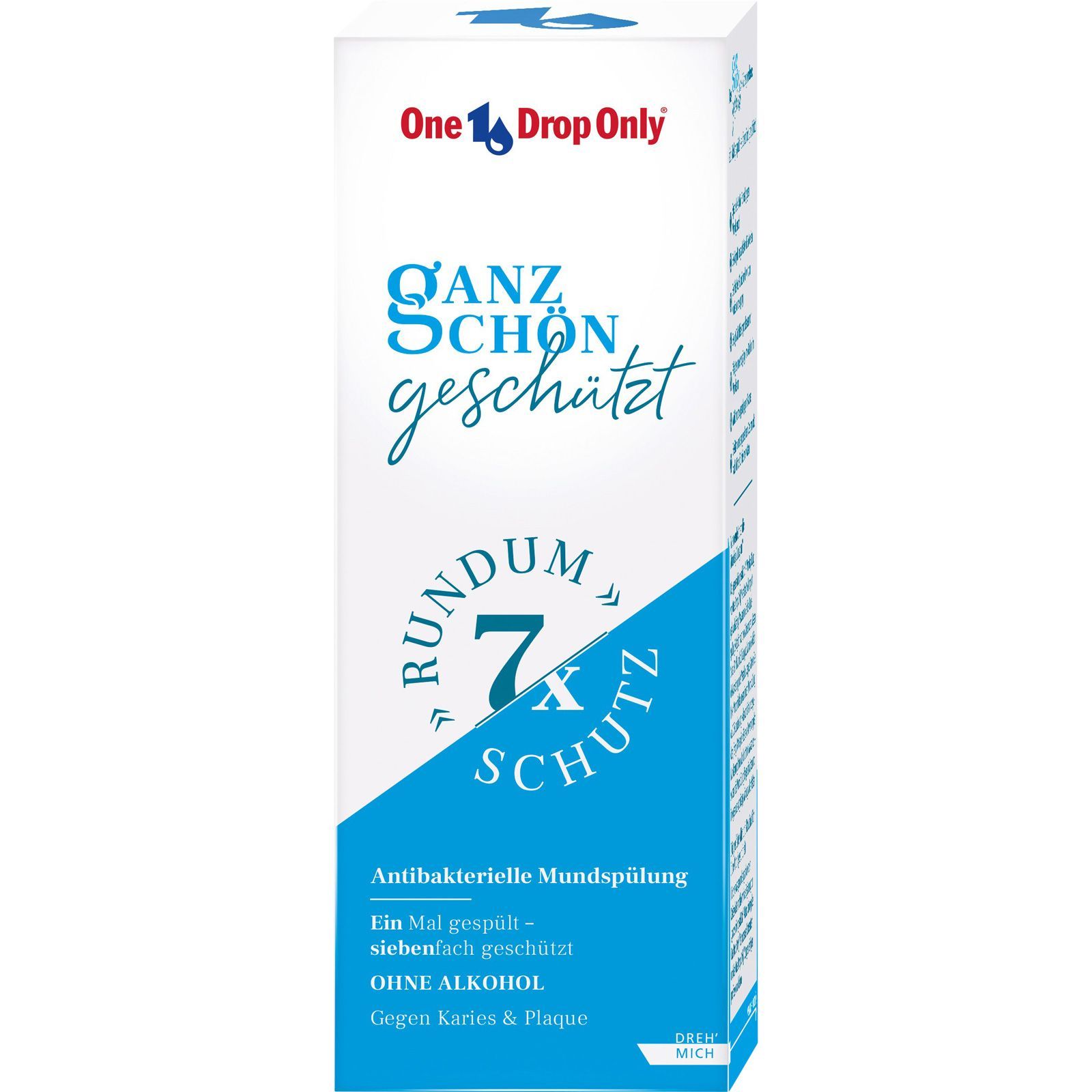 Die One Drop Only ganz schön geschützt Mundspülung verfügt über eine verbesserte Formel mit 7x Rundumschutz Formel. Dank der speziellen Inhaltsstoffe Fluorid, Xylit, Zink und CPC werden die Zähne langanhaltend vor Plaque und Karies geschützt.
