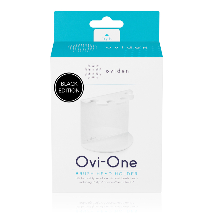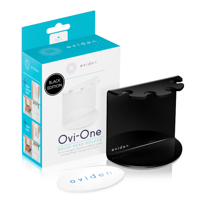 Der Halter OVIDEN® Ovi-One eignet sich für die Aufbewahrung von Bürstenköpfen für elektrische Rotations-, Schall- und Ultraschallzahnbürsten der meisten auf dem Markt erhältlichen Marken. Dank seiner speziellen Form erlaubt der Halter Ovi-One eine problemlose und bequeme Befestigung von vier Bürstenköpfen. Entsprechend profilierte Einkerbungen gewährleisten einen stabilen Halt der Bürstenköpfe. Die Entfernung zwischen den vertikal aufbewahrten Bürstenköpfen ist so gewählt, dass sie sich gegenseitig nicht berühren können. Feuchtigkeitsreste in den Bürstenfasern tropfen auf den Halterfuß, ohne die Badezimmerarmatur oder Möbel zu verunreinigen. Die auf diese Weise aufbewahrten Bürstenköpfe werden gut belüftet und ihre Fasern können schnell trocknen.