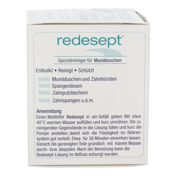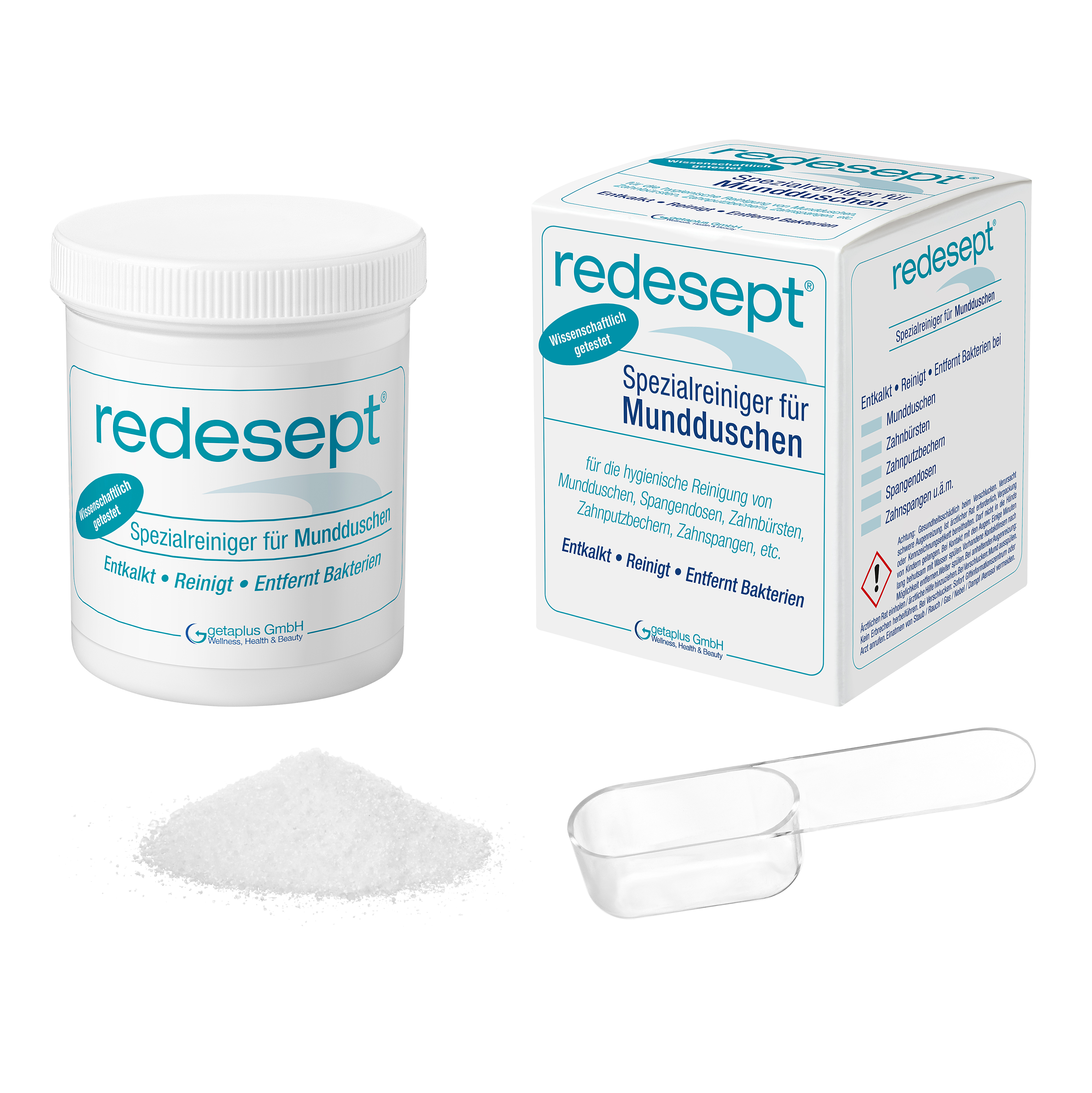 Redesept Spezialreiniger wurde speziell zur Reinigung und Entkalkung - insbesondere von Mundduschen, Zahnbürsten, Zahnputzbechern, Zahnspangen u.ä.m. - entwickelt und ist wissenschaftlich getestet. Redesept Spezialreiniger enthält neben waschaktiven Substanzen zur Reinigung auch aktiven Sauerstoff. Dadurch entwickelt das Pulver ganz selbststätig innerhalb weniger Minuten eine reinigende Wirkung.