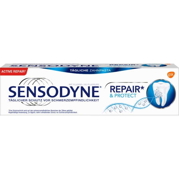 Repair & Protect beinhaltet eine hochmoderne Zinnfluorid-Technologie, die eine Schutzschicht über dem freiliegenden Dentin bildet, so dass schmerzhafte Reize nicht mehr zum Nerv vordringen können. Zusätzlich bietet sie alle Vorteile einer normalen Zahnpasta und hilft, das natürliche Zahnweiss zu erhalten.