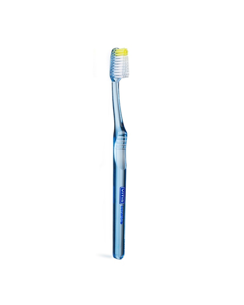 Die VITIS sensitive Zahnbürste ist speziell für Personen mit empfindlichen Zähnen und mit Zahnfleischrückgang empfehlenswert. Es handelt sich um eine Zahnbürste, die über sehr weiche Borsten verfügt, wodurch insbesondere das Zahnfleisch geschont wird. Diese Borsten sind einer flachen Bürstenoberfläche angeordnet, der Bürstenkopf ist rautenförmig.
