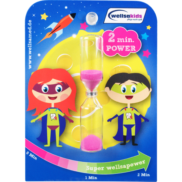 Mit der wellsakids Sanduhr wird die Dauer der zahnärztlich empfohlenen 2 Minuten Zahnputzzeit zum Kinderspiel.